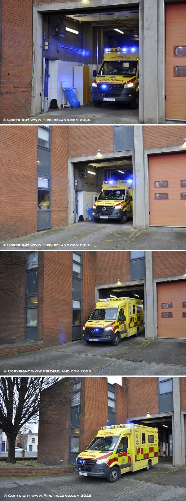 Dublin Fire Brigade North Strand fire station Ambulance "Delta 1" seen turning out from station on Wednesday 14th January